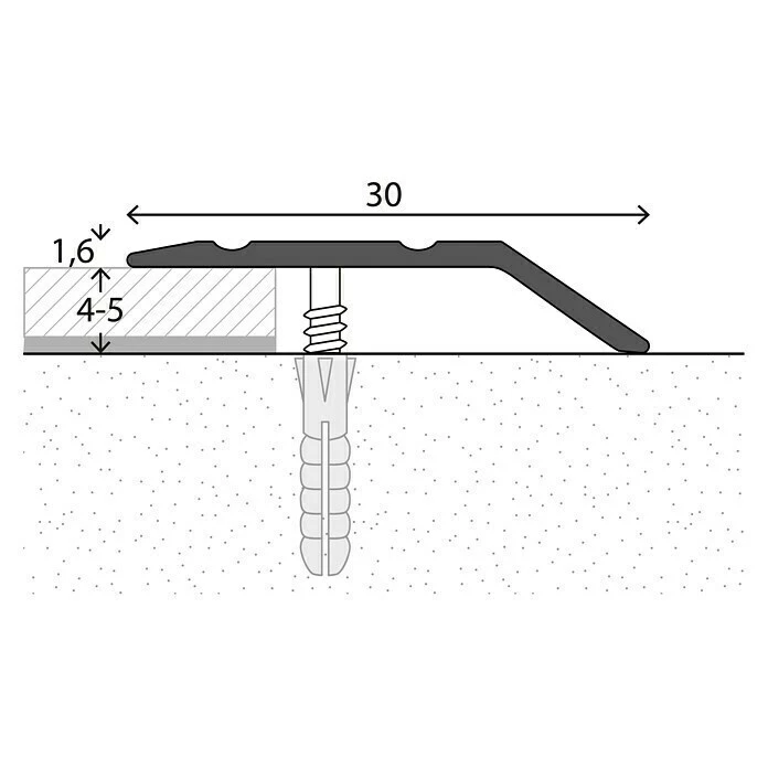 Das LOGOCLIC Abschlussprofil schützt die Belagskanten vor Beschädigungen und beseitigt Stolperkanten mit Hilfe des flachen Profilschenkels. Es eignet sich perfekt zum Abdecken von Nahtstellen verschiedener Bodenbeläge mit wenig Aufbauhöhe, wie zum Beispiel Teppich-, Vinylboden oder PVC. Benötigt wird das Aluminiumprofil etwa an Türübergängen. Es verfügt über versenkte Bohrungen, der Höhenausgleich beträgt 4 – 5 mm.