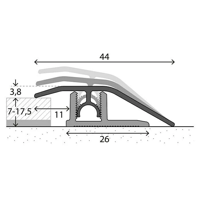 Das LOGOCLIC Anpassprofil ist für Bodenbelagstärken von 7 – 17,5 mm konstruiert. Verdeckt befestigt bietet es eine perfekte Optik ohne Schraublöcher. Die flache Oberfläche ohne Zierrillen sorgt für zeitlose Eleganz. Die Montage ist besonders schnell und einfach. Zunächst wird das Basisprofil mit Montage- oder einem Zwei-Komponenten-Kleber auf dem Untergrund verklebt. Alternativ kann das Basisprofil auch verschraubt werden. Mit dem bogenverzahnten Gelenksteg rastet das Oberprofil im Basisprofil ein und passt sich automatisch dem Bodenbelag an – variabel in Höhe und Neigung. Auch bei stärkeren Niveauunterschieden liegt das Profil an beiden Seiten dicht an. Gleichzeitig erlaubt die Bogenverzahnung die problemlose Demontage. Das Oberprofil kann bei Bedarf gelöst und anschließend wieder im Basisprofil verankert werden. Die Profile wurden vom deutschen TÜV auf eine Punktbelastbarkeit von 1,5 Tonnen getestet. Hinweis: Passender Klebstoff oder Montagematerial ist separat zu erwerben.
