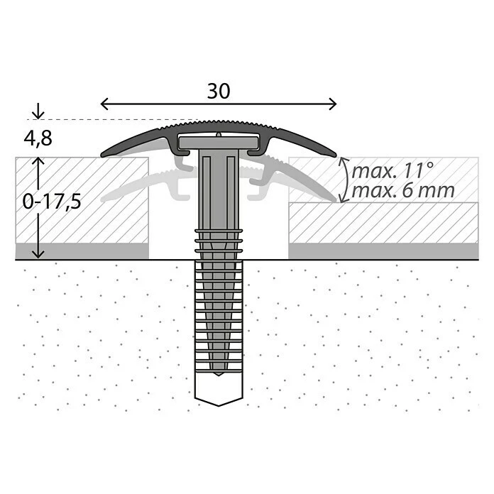 Das LOGOCLIC Übergangsprofil wird mit Nylon-Lamellendübeln verdeckt befestigt. Ins Bohrloch eingetrieben, krallen sich die Lamellen an der Bohrlochwand fest und sorgen für dauerhaften Halt. Zugleich bewirkt die Elastizität des Dübels, dass sich das Profil in Höhe und Neigung dem Bodenbelag und Niveauunterschieden anpassen kann. Im Gegensatz zu Profilen mit vorgegebenen Bohrlöchern können die Bohrlöcher dort gesetzt werden, wo die Haltekräfte benötigt werden, z.B. in Laufstraßen. Da das Profil ohne Basisprofil verarbeitet wird, ist es die ideale Lösung, um Dehnungsfugen im Bodenbelag nachträglich zu schließen.