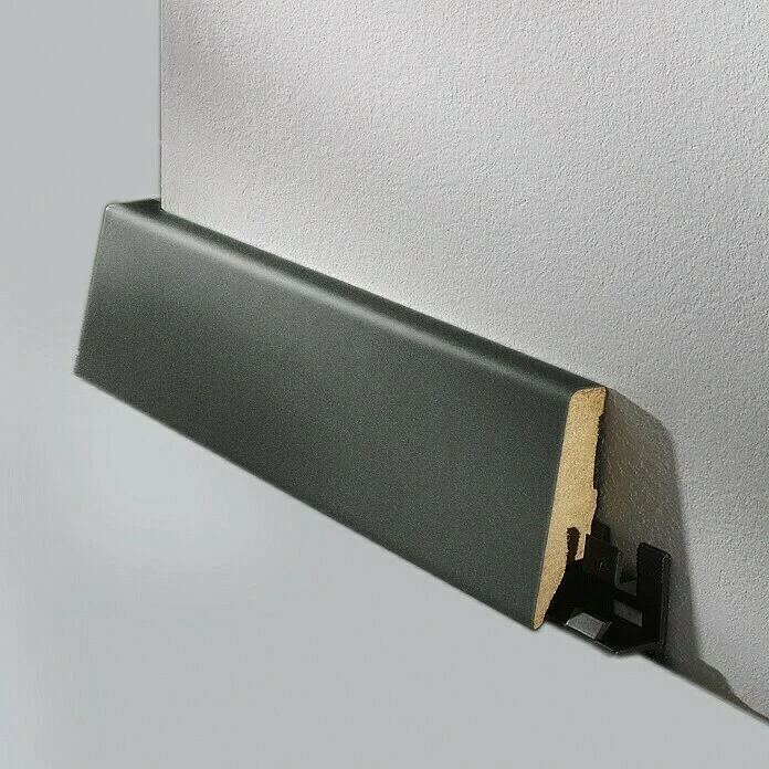 Die Sockelleiste von LOGOCLIC® mit ihrer klaren Form und hochwertigen Verarbeitung ist ein ausdrucksvolles Element für das designorientierte Einrichten. Die aus massivem Trägermaterial gefertigte Leiste ist mit einer Dekorfolie in Anthrazit ummantelt. Separat erhältliche Montageclips garantieren eine einfache Befestigung und lassen eine versteckte Kabelverlegung zu.