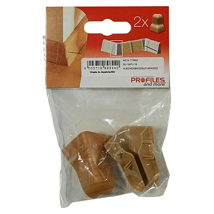 Die Außenecke von Profiles and more besteht aus hochwertigem Kunststoff und erleichtert die Sockelleistenmontage. Die Ecke wird einfach zwischen die Enden der rechtwinkelig geschnittenen Leisten gesteckt. Dadurch ist kein komplizierter Gehrungsschnitt mehr notwendig und die Leistenecke ist gegen Stöße geschützt.