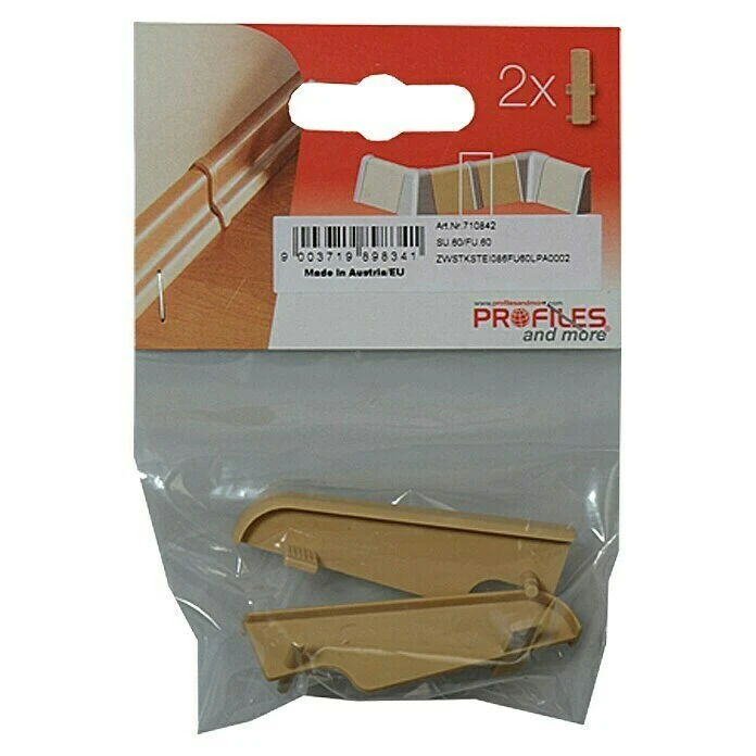 Das Zwischenstück von Profiles and more besteht aus hochwertigem Kunststoff und erleichtert die Sockelleistenmontage. Es wird einfach zwischen die Enden der rechtwinkelig geschnittenen Leisten gesteckt und ermöglicht somit eine saubere Verbindung von zwei Leisten.