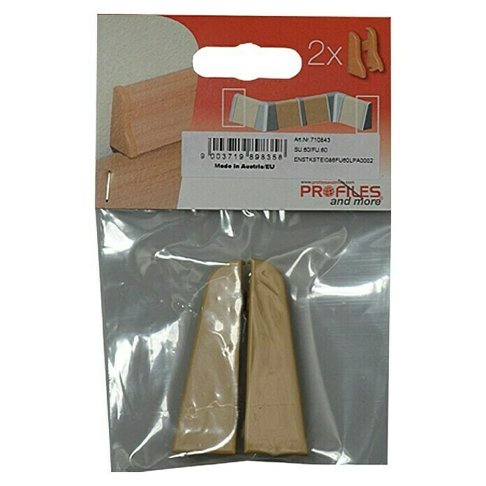Die Endkappe von Profiles and more besteht aus hochwertigem Kunststoff und erleichtert die Sockelleistenmontage. Sie wird einfach auf das Ende der rechtwinkelig geschnittenen Leiste gesteckt und sorgt somit für einen optisch ansprechenden Abschluss der Leiste. Das Trägermaterial der Formleiste wird somit völlig von der Endkappe verdeckt und ist optimal gegen Stöße geschützt.